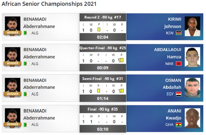 Pour ce faire, l’expérimenté BENAMADI a fait un parcours sans faute en battant respectivement le Kényan KIRIMI, le Marocain ABDELLAOUI, l’Égyptien OSMAN et enfin le Ghanéen ANANI. Et il ne fallait pas perdre de temps car il a gagné chaque combat par Ippon.